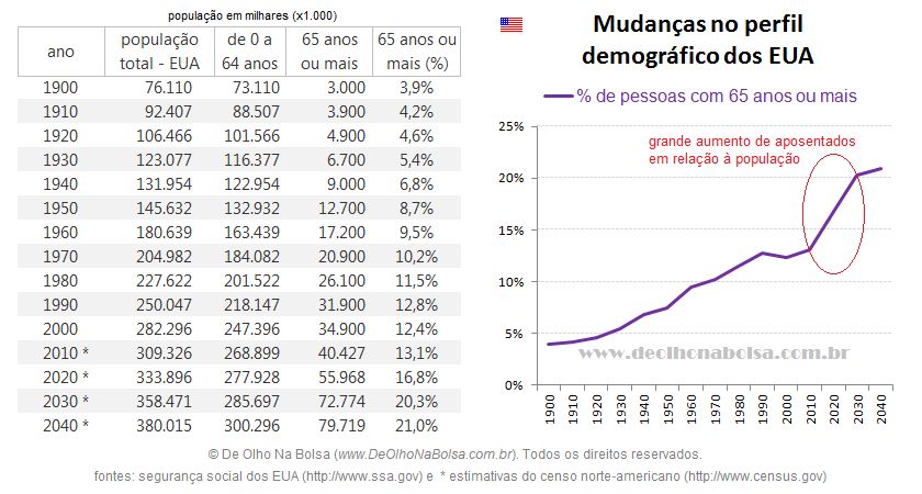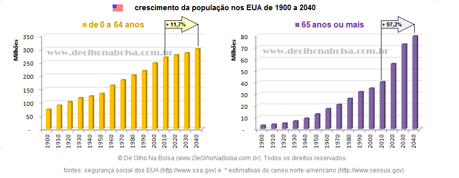 Em 2010, o número de norte-americanos com 65 anos ou mais era de 40,4 milhões. Em 2040, essa mesma faixa