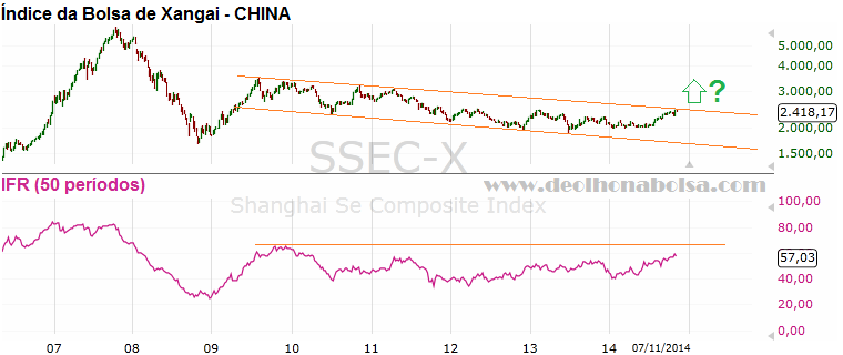 O índice de Xangai também formou um canal de 2009 para cá. Nesse caso, o canal é de baixa. Estando também