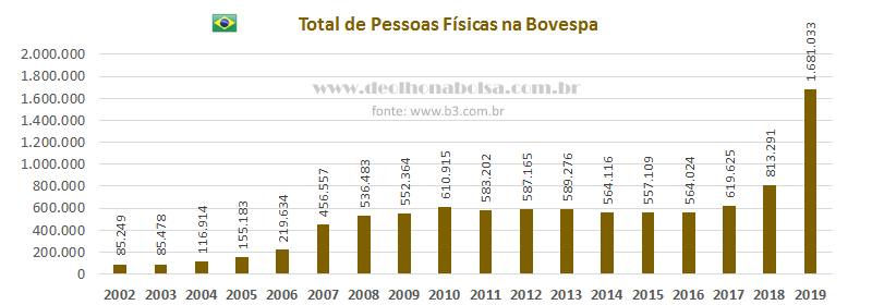 lhufas para mim! Não vou lucrar com qualquer dessas atividades, a menos que seja como acionista da B3. Eu invisto por conta e risco próprio. O que é bom para os profissionais desse mercado, pode não ser bom para mim, como investidor. O melhor é fazer minha própria leitura dos dados. Por isso, pesquisei o histórico de CPFs registrados na B3 (BMF Bovespa).