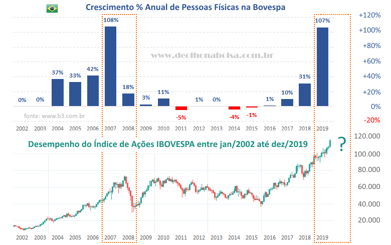 A retrospectiva histórica também mostra algo que não vem sendo divulgado. Assim como o número de CPFs mais que dobrou em 2019, um precedente semelhante foi registrado na Bolsa em 2007. Ali é que está um balde de água fria. Alguns meses depois, em maio de 2008, o Ibovespa deixou um pico importante. Dali, o índice de ações perderia cerca de 60% do seu valor em menos de 5 meses. As ações voltariam ao nível de março de 2005. Um retrocesso de 3 anos e 2 meses! Como diz o ditado, as ações sobem de escada e descem de elevador! E a recuperação daquela queda de 5 meses levou mais de 9 anos para acontecer. Só em setembro de 2017 voltamos ao pico de maio de 2008. Se computarmos a inflação monetária, como mostrei em "
