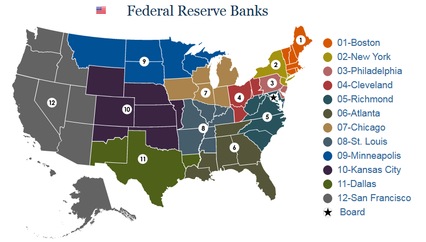 Federal Reserve System, conhecido como banco central dos EUA. Na verdade, é um sistema constituído por doze bancos centrais regionais. Sendo cada um deles propriedade de bancos comerciais privados que atuam nas respectivas regiões geográficas.
