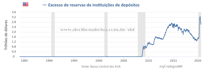 Esta defasagem é resultado da falta de acesso, da economia real, à quantidade de dinheiro ainda confinado no sistema financeiro. Quase nada dos novos dólares criados passou pelas mãos da população. Observe abaixo o excesso de reservas dos bancos americanos desde 2008:
