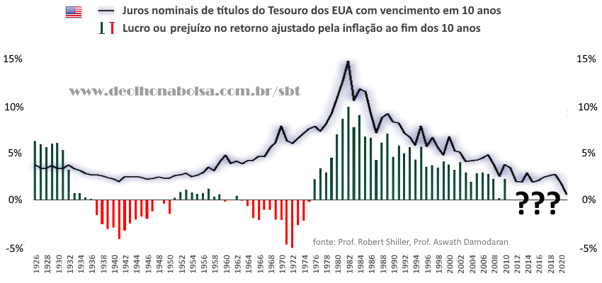 O estudo abaixo é de Robert Shiller, prêmio Nobel em economia. Ele mostra um histórico dos retornos reais obtidos nos títulos do Tesouro americano de 10 anos (levados até o vencimento e ajustados pela inflação).