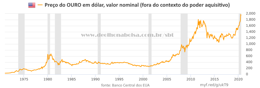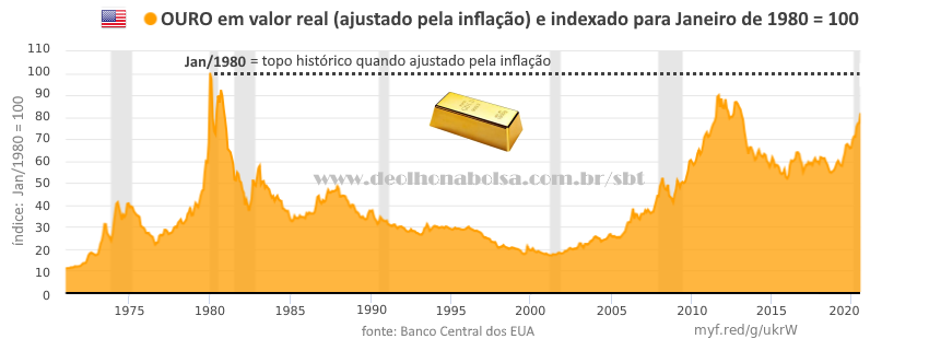 Assim é que compreendemos a situação real do ouro nos últimos cinquenta anos. Seu valor recorde, ou topo histórico, foi lá em 1980. Não foi em 2011, nem mesmo em 2020... Pelo menos por enquanto.