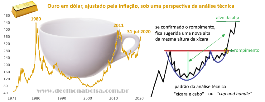 Para quem segue a análise técnica, é interessante observar que está se formando aí uma enorme figura de "xícara e cabo". Se confirmada, ela sugere uma alta mais animada para o metal.