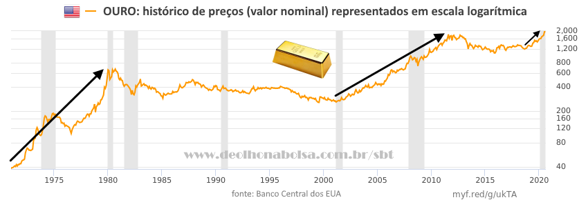 Contudo, as maiores altas ocorreram há muitos anos já. A primeira foi desde 1971 até 1980, iniciando-se logo depois do dólar abandonar sua conversibilidade em ouro. Acentuou-se com as crises do petróleo: a primeira, em 1973, e a segunda, em 1979. Outra alta espetacular foi de 2001 a 2011. Essa segunda começou após o estouro da bolha de tecnologia, passando pelo ataque terrorista ao World Trade Center, continuou pela bolha imobiliária americana (das hipotecas subprime), pela crise financeira global, pela crise da zona do euro e, finalmente chegou à primavera árabe. Na escala logarítmica abaixo, percebemos que a alta dos últimos dois anos ainda pode ser considerada modesta e curta, se comparada às anteriores.