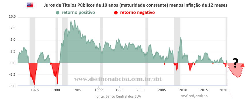 No gráfico seguinte, eu mesmo fiz uma simplificação com as taxas de juros de Títulos do Tesouro dos EUA com vencimento em 10 anos e subtraí a inflação de 12 meses. O objetivo é ter uma ideia do potencial para o futuro próximo.
