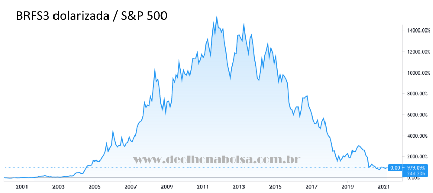 Agarrar facas caindo não é uma boa ideia. No entanto, acredito que BRFS3 pode ser uma aposta promissora para esta década. O gráfico abaixo mostra, à esquerda, os preços em dólares da BRFS (