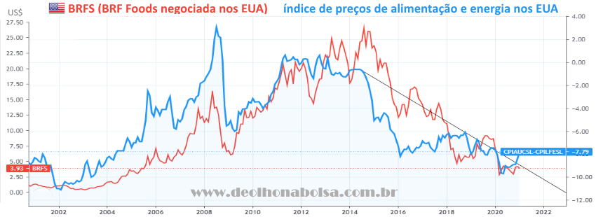 American Depositary Receipts das ações da BRF Foods) e, à direita, o índice de preços de alimentação e energia nos EUA. Vinte anos atrás, a linha azul se antecipou, puxando a BRFS (linha vermelha) logo a seguir. Este ano, a linha azul já rompeu a tendência de baixa. Sugere uma inflação nos preços de alimentos e energia. Isso deve puxar novamente as ações da brasileira BRF Foods, bem como suas ADRs em Nova York.