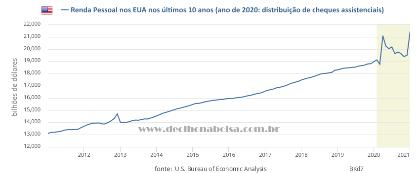 A distribuição de dinheiro pelo Tesouro Americano para a população aumentou a renda pessoal nos EUA. Americanos desempregados, agora sem produzirem quaisquer bens ou serviços, passaram a ganhar mais do que quando trabalhavam.