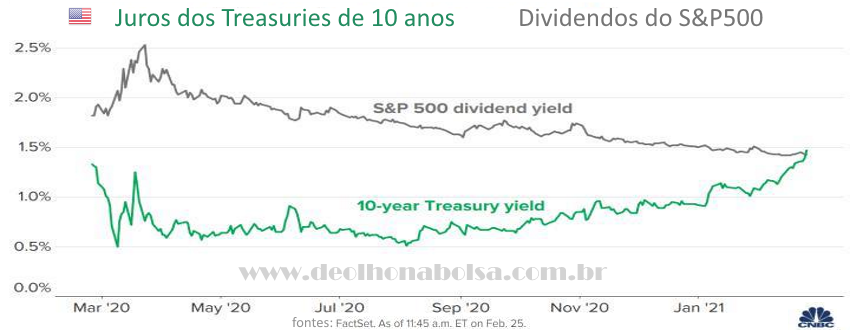 Não sei se isto reverterá a alta das bolsas pelo mundo. Mas os juros de longo prazo sobem com a ansiedade dos investidores. Já estão antecipando a erosão no valor do dinheiro. Nas últimas semanas, os juros dos títulos públicos americanos de dez anos alcançaram o mesmo nível dos dividendos calculados para a carteira teórica do S&P500. Neste patamar, a renda fixa concorre com a renda variável. Assim é natural que as bolsas sejam sacudidas. Se cairão ou não, o tempo dirá.