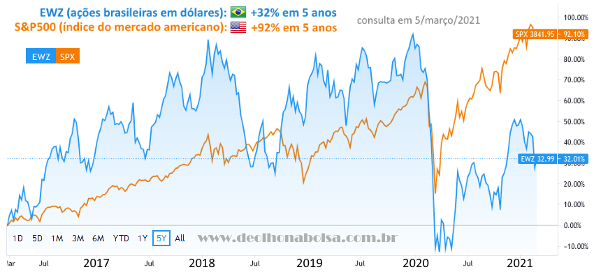 Pode até parecer contraditório meu repúdio ao risco naquela época (pré-COVID), se agora, em plena pandemia e desalento econômico, sou mais indulgente com a bolsa brasileira. Mas, entre março de 2016 e fevereiro de 2020, a bolsa brasileira havia se valorizado mais que a bolsa americana. Já não é o caso. Agora a bolsa americana mostrou um desempenho bem melhor que a brasileira. Os últimos cinco anos podem ser vistos nesta comparação entre o S&P500 e o EWZ, fundo americano cuja carteira de empresas brasileiras é basicamente um Ibovespa em dólares.