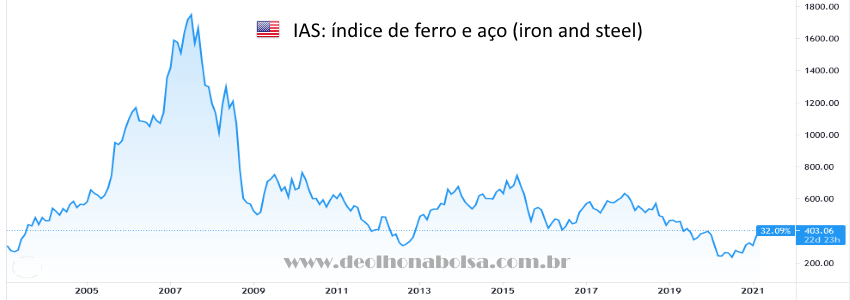 commodities tende a subir em relação ao dólar. No gráfico abaixo, ferro e aço parecem ter muito potencial de alta pela frente.