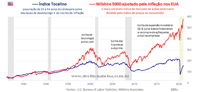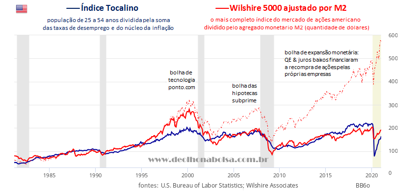 A primeira coisa a observar é o divórcio entre o mercado de ações e a realidade econômica das últimas duas décadas. Usando o Índice Tocalino, eu estimo o potencial do mercado consumidor nos EUA. É surpreendente como este indicador também reflete as oscilações da bolsa americana, apesar de mostrar três grandes defasagens desde setembro de 1996.