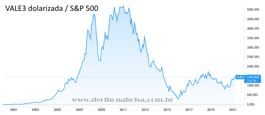 Tudo é relativo! VALE3 subiu muito quando comparada à bolsa brasileira. Subiu bem menos em dólares numa comparação com o S&P500! As ADRs da VALE (negociadas em dólares nos EUA) divididas pelo S&P500 mostram o mesmo.