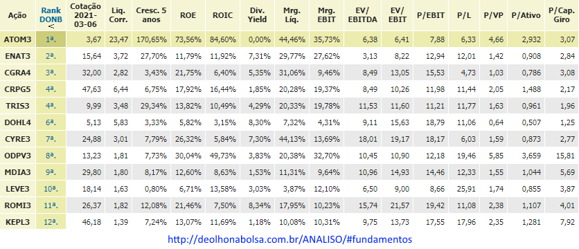 Confira o Ranking DONB de empresas com múltiplos e indicadores fundamentalistas interessantes: