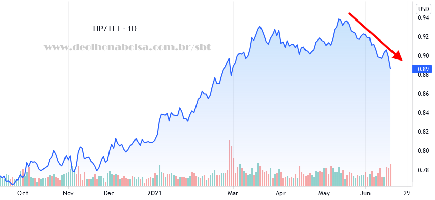 Melhor indicador ainda da queda na percepção de inflação pelo mercado é a relação plotada abaixo. O gráfico mostra o ETF de títulos públicos protegidos contra a inflação (TIP), dividido pelo ETF de títulos públicos convencionais (prefixados e não indexados à inflação) de vinte anos ou mais (TLT). Desde a segunda semana de maio, esta razão mostra que a maioria do dinheiro no mercado já enxergava uma queda da inflação futura. Aquela que Jay Powell sugeriu esta semana.