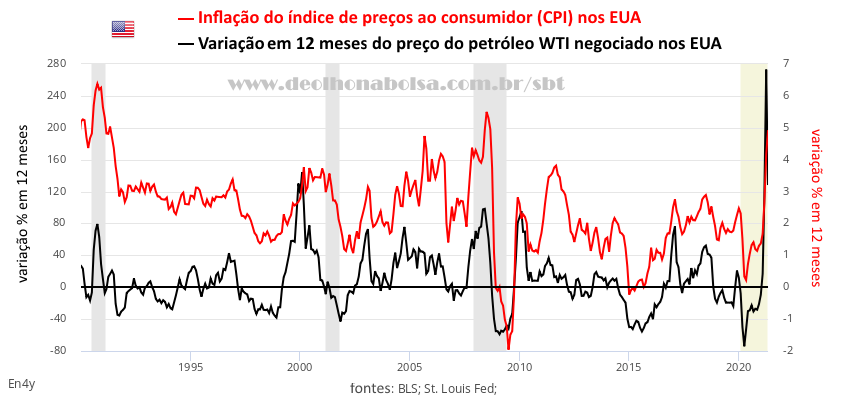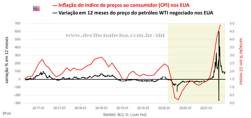Realmente tivemos dois meses de destaque de inflação nos EUA: abril e maio. Ao comparar os preços destes meses, com os de abril e maio do ano anterior (pleno pânico da pandemia), fica justificada uma grande alta. A base de comparação, em 2020, foi muito baixa. Os preços do petróleo caíram violentamente naquele primeiro isolamento social. Em abril de 2020, os preços ficaram negativos no mercado futuro. Quem tinha o compromisso de receber o petróleo estava pagando para que outro ficasse com a