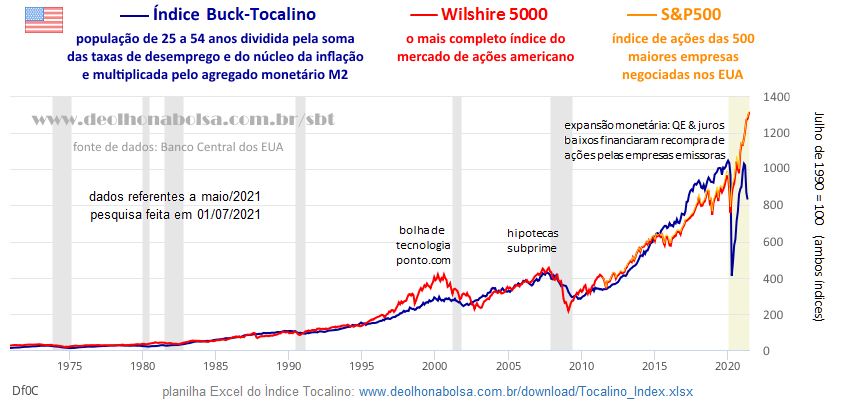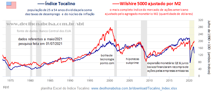 Para vermos suas oscilações mais detalhadamente, reduzindo a amplitude do eixo vertical, em vez de multiplicar meu indicador pelo agregado monetário M2, podemos usar o Índice Tocalino (sem M2) e simplesmente dividir o índice de ações por este mesmo estoque de dólares.