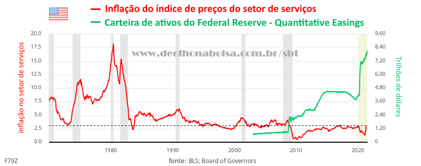 No gráfico abaixo, a linha vermelha mostra a inflação no índice de preços de serviços. Parece-me que uma eventual inflação sistêmica, persistente e generalizada, teria que se manifestar aí. Mas não se manifesta! Desde 2008! Anda mais baixa que antes dos QEs todos começarem.