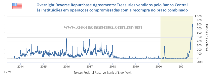 O banco central americano vem aumentando de forma impressionante suas operações reversas no Repo Market. Tenta saciar o crescente apetite das instituições pelos títulos do Tesouro. Se existe tal demanda pelos títulos públicos, então é porque há interesse nestes juros. Não estão tão baixos assim, podendo baixar mais ainda. Ou seja, os títulos se valorizariam à medida que os juros caíssem mais! O mercado mostra-se receptivo a eles. Observe a rápida aceleração nas operações reversas do Fed no Repo Market, entregando mais e mais títulos públicos ao mercado. O nível já está à volta de um trilhão de dólares!