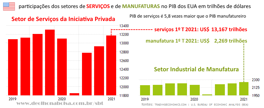 No primeiro trimestre de 2021, o setor de serviços contribuiu com US$ 13,167 trilhões para o produto interno bruto dos EUA. Quase seis vezes mais que a indústria manufatureira, com apenas US$ 2,269 trilhões.
