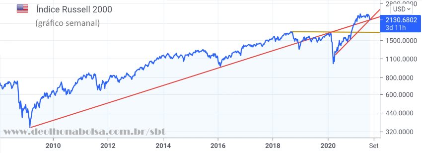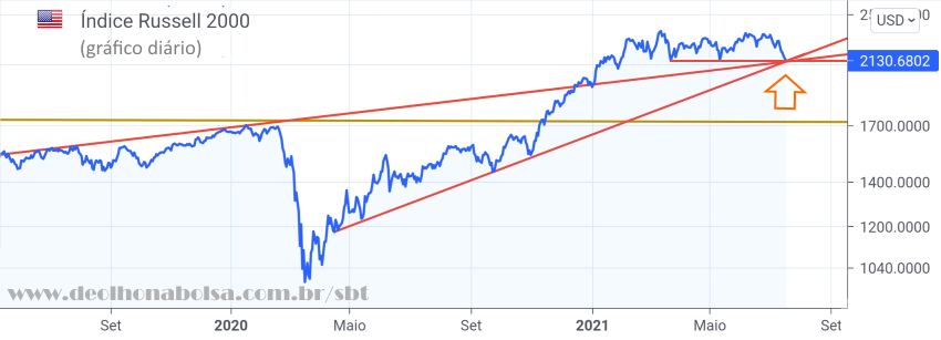 O Russell 2000 é um índice de small caps dos EUA. Ele está exibindo uma situação gráfica que merece atenção. As linhas de tendência e suporte estão todas se cruzando nesta semana. Normalmente, isto indica um forte suporte. O Russel 2000 pode repicar aí e voltar a subir por um tempo, até tentar nova queda. No entanto, se estas small caps mostrarem maior aversão ao risco, rompendo para baixo das linhas, a coisa se complica.
