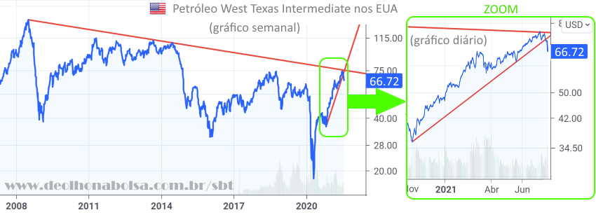O preço do petróleo negociado nos EUA (OIL_CRUDE, West Texas Intermediate), recuando mais de 6% na segunda-feira, endossou a minha análise. Cedeu seu ritmo de alta para uma potencial reapreciação do dólar, conforme minhas expectativas.