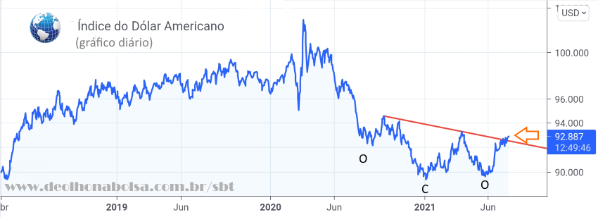 Nos últimos dias, o próprio índice do dólar, isoladamente, sugere um repique de alta para a moeda americana, ao romper a linha do pescoço de um ombro-cabeça-ombro (O-C-O) invertido.