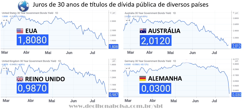 A busca por títulos públicos de 30 anos vem baixando os juros de longo prazo em diversos países. Sugerindo uma grande aversão ao risco e um maior temor de desinflação (ou mesmo deflação). Ou seja, situação diametralmente oposta ao discurso tão popular de 'escalada inflacionária'.