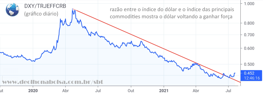 O gráfico a seguir mostra a razão do índice do dólar sobre o índice das principais commodities no mundo, evidenciando o rompimento daquela tendência que nos favorecia.