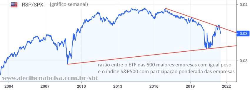 Ao dividirmos o RSP pelo SPX, fica óbvio que a alta do S&P500 vem acontecendo graças a um menor número de empresas mais fortes. A maioria das empresas já está na retaguarda, indicando cansaço e perda força.