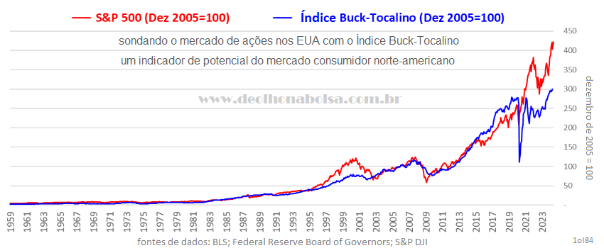 Apesar de serem exibidos de forma diferente, os dois gráficos acima são traçados com os mesmos dados. O segundo gráfico mostra todas as discrepâncias históricas mais detalhadamente, enquanto o primeiro gráfico salienta melhor a relação histórica entre o mercado de ações e o potencial de consumo sugerido pelo Índice Buck-Tocalino.