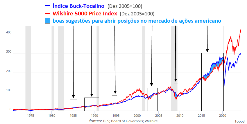 O próximo gráfico mostra o Wilshire 5000, índice que abrange 100% das ações nos EUA, versus o Índice Buck-Tocalino. Toda vez que a linha azul do meu indicador é vista acima da linha vermelha do mercado de ações, há uma sugestão para a compra de ações ou ETFs que sigam o S&P 500.