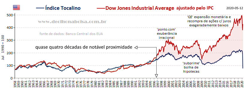 O gráfico que usei anos atrás pode ser visto abaixo. Mostra o Índice Tocalino comparado ao Índice Dow Jones ajustado pelo índice de preços ao consumidor americano. Ambos os históricos foram indexados em julho de 1990 aos 100 pontos. O ajuste dos valores nominais para valores reais, dividindo o Dow Jones pelo índice de preços ao consumidor (IPC), foi uma decisão infeliz. Caso queira entender melhor o progresso deste indicador, consulte os artigos anteriores de 2014 e 2020.