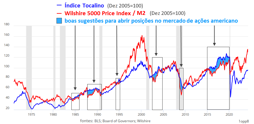 Esta é uma boa razão para ainda usarmos o Índice Tocalino (sem os dólares de M2), em vez de o substituir completamente pelo mais recente Índice Buck-Tocalino. Nos gráficos estáticos, não interativos, o Índice Tocalino pode ser comparado ao índice da bolsa dividido pelos dólares de M2. É aritmética básica: em vez de multiplicar um lado da expressão, M2 passa a dividir o outro lado. A equivalência matemática se mantém, mas a escala vertical diminui, mostrando muito mais detalhes. O passado e o presente poderão ser analisados simultaneamente e de forma muito mais proporcional. Confira: