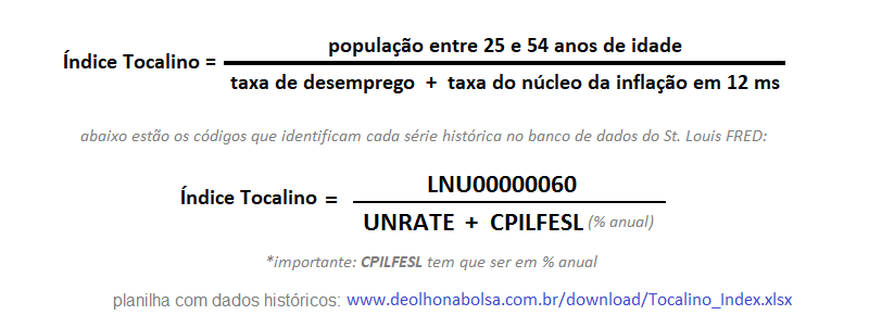 Para calcular o Índice Tocalino, basta dividir esse grupo etário que faz gastos crescentes, pela soma das taxas de desemprego e núcleo da inflação em 12 meses.