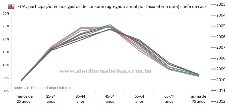 Segundo registros do Bureau of Labor Statistics, os domicílios americanos cujo principal provedor tem entre 25 e 54 anos de idade apresentam uma crescente participação no consumo nacional. Quando os jovens se emancipam e entram no mercado de trabalho, muitos se casam e têm filhos. À medida que amadurecem, acumulando mais responsabilidades e ambições, eles trabalham, ganham e gastam mais na economia. Segundo as estatísticas, essa tendência de consumirem cada vez mais avança até os cinquenta e cinco anos de idade.