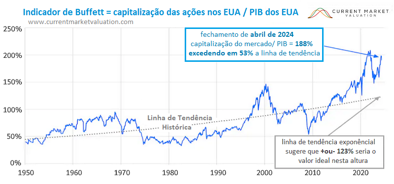 Atualmente, mais uma vez, o indicador de Buffett concorda com o índice Buck-Tocalino. Ambos endossam o alerta insistente das curvas de juros invertidas: a bolsa norte-americana parece estar alta demais.