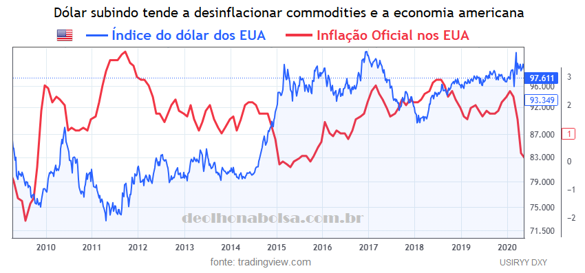 Um dos sinais de alerta desinflacionário é o índice do dólar (DXY). Zeberg acredita que o DXY pode atingir níveis de 120 a 123 pontos. Em um mundo movido a eurodólares (dólares sintéticos criados por financiamentos offshore, onde o Fed não arbitra), a dívida global é massivamente atrelada ao valor da moeda americana. Uma valorização do dólar forte seria um péssimo sinal para a saúde da economia mundial. A moeda americana valorizada se torna um garrote vil para conseguir novos financiamentos ou servir e rolar dídidas antigas.