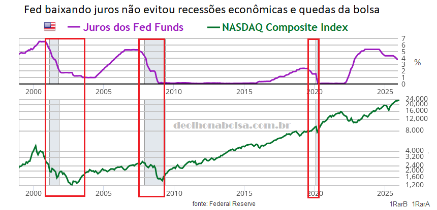 Além disso, a história nos oferece um aviso contra-intuitivo: os cortes de juros do Fed não são a salvação, mas sim uma confissão velada de que algo já quebrou irreparavelmente.
