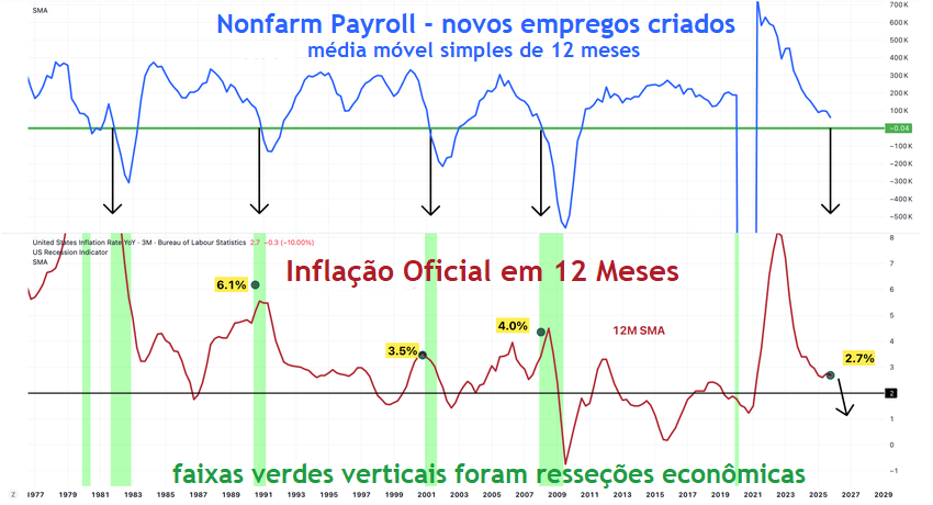 Enquanto o brilho das bolsas nas alturas ofusca e distrai, com índices de ações batendo recordes nominais, os fundamentos da criação de riqueza estão acusando um colapso à frente. Em dezembro, a criação de empregos privados nos EUA registrou apenas 41.000 novas vagas. Zeberg se refere aos números divulgados em 7 de janeiro pelo ADP National Employment Report. Para um detetive macro, o detalhe mais contundente não é um número isolado de uma série aparentemente errática, mas sim o sentido da média móvel: