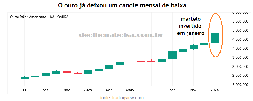 Pelo menos temporariamente, o ouro já deu um sinal de esgotamento da tendência de alta. Deixou um martelo invertido no gráfico mensal, uma figura também conhecida como "topping tail" no gráfico de velas (candles). O longo pavio para cima é evidência de uma euforia altista que deu meia volta e fechou o mês já apontando para baixo.